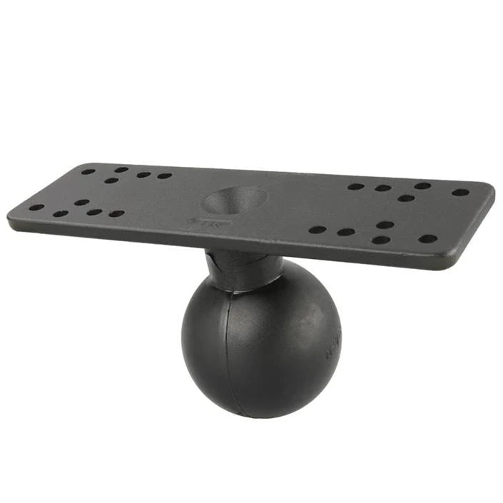 RAM-D-115BU, universal monteringsplatta, består av en kula med en diameter på 2,25″, vinkelrätt ansluten till en plan 6,25″ x 2″ rektangulär platta. Plattan innehåller olika kombinationer av förborrade hål som passar många elektroniska enheter.