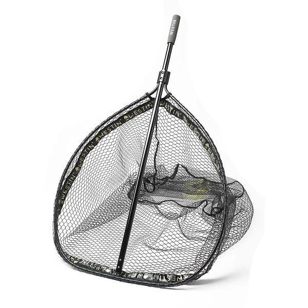 Westin W3 Catch & Release Landing Net med knutlöst gummerat hÄvnÀt för att skona fiskens slemskikt samtidigt som krokarna inte trasslar in sig lika lÀtt. Lasergraverad mÀtlinjal (85 cm) pÄ hÄvskaftet gör mÀtningen av din fisk oerhört smidig.